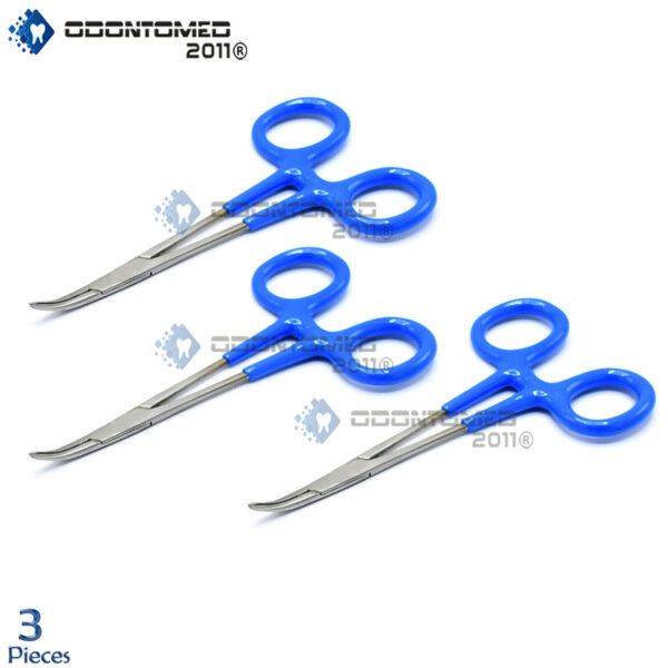 PRODUCT NAME: 3 Mosquito Forceps Curved 5″ With Blue PVC Dep Handle Surgical Instruments QUANTITY: 3 Pieces Brand