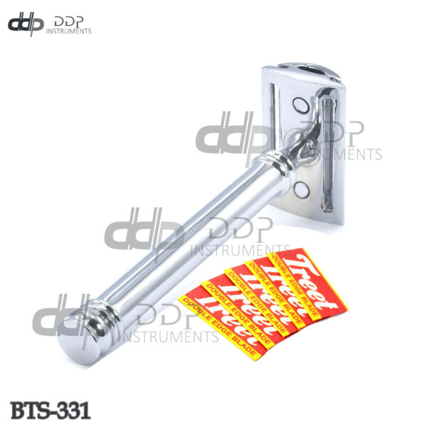 ITEM NAME & DETAILS : 3.5″ Plain Handle Safety Razor Chrome Plated +5 Blades Double Edge Item Code: BTS-331 Set