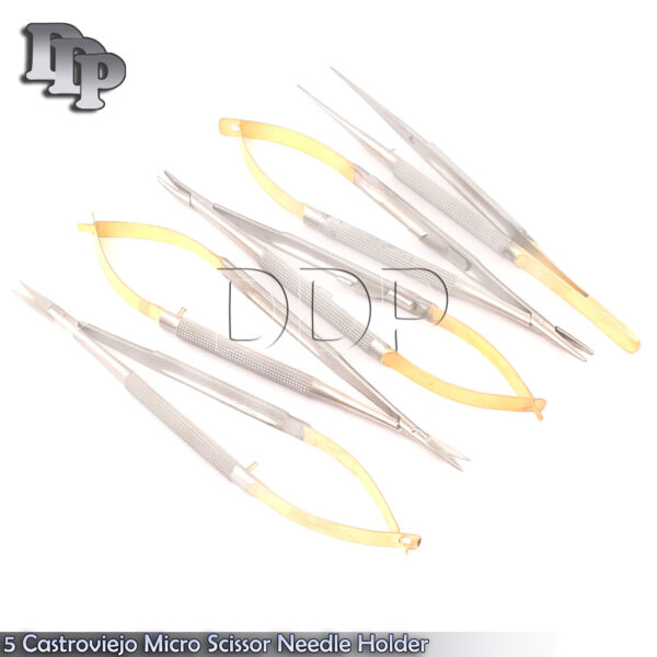 Ā 5 GERMAN Castroviejo Micro Scissors Needle Holder STR + CVD Forceps Dental EYE Gold Handle This Set Included: