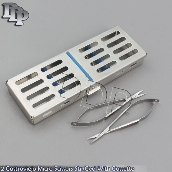 ITEM NAME & DETAILS : 2 CASTROVIEJO MICRO SCISSORS CURVED+STRAIGHT TIP 4.5″ W/ STERILIZATION CASSETTE SET INCLUDES :1 O.R GRADE