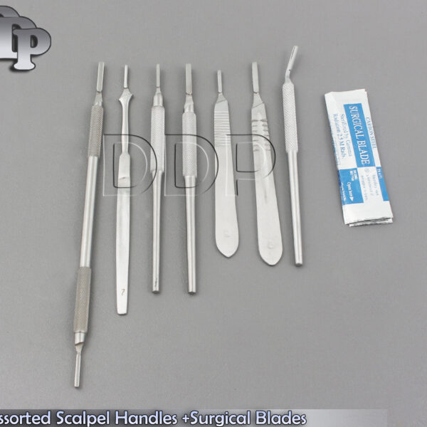 ITEM NAME & DETAILS : 7 Assorted Scalpel Handles #3 #4+100 Sterile Surgical Blades (#10-15) (#20-24) Set Detail…..: 1 Scalpel