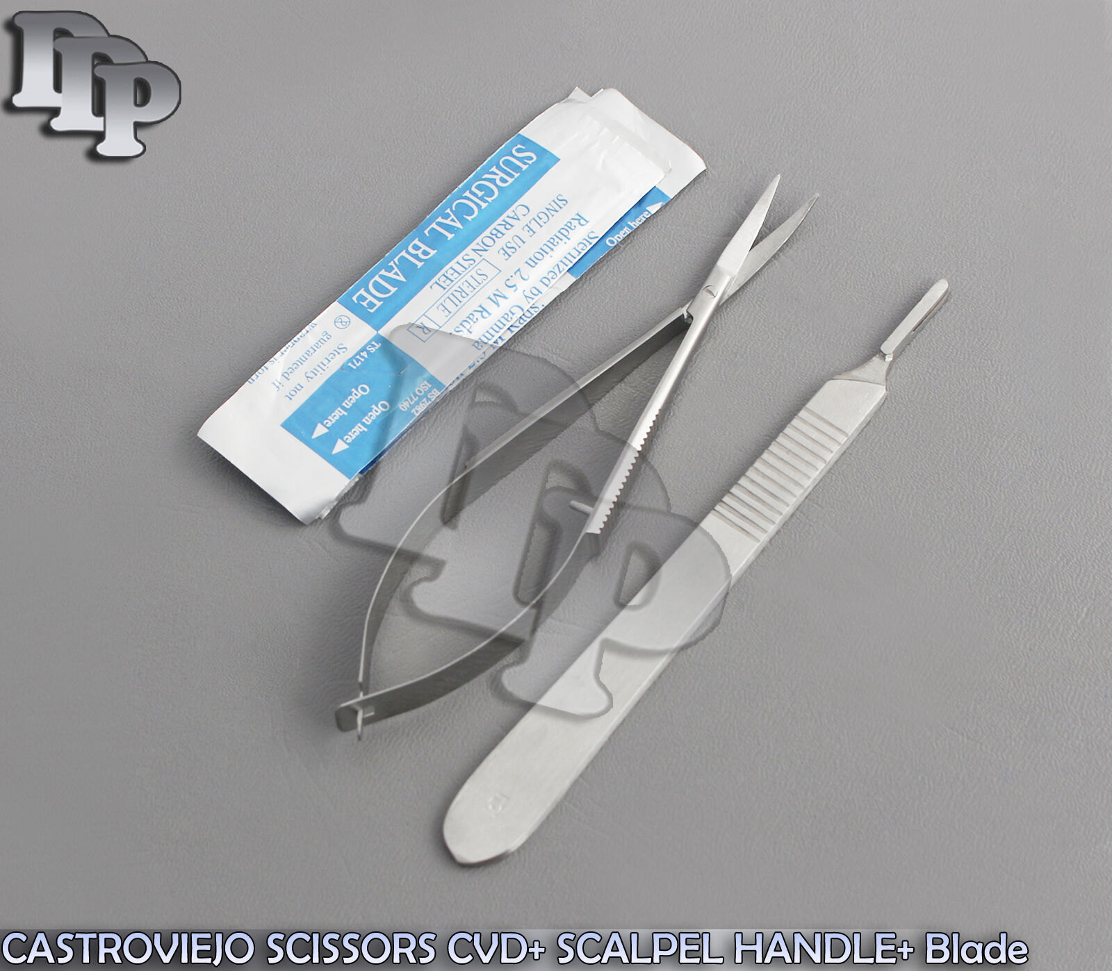 HomeShopSurgical InstrumentsScalpel Handles And Blades CASTROVIEJO SCISSORS CURVED 4.5”+ SCALPEL HANDLE #3 + 5 SURGICAL BLADES #15