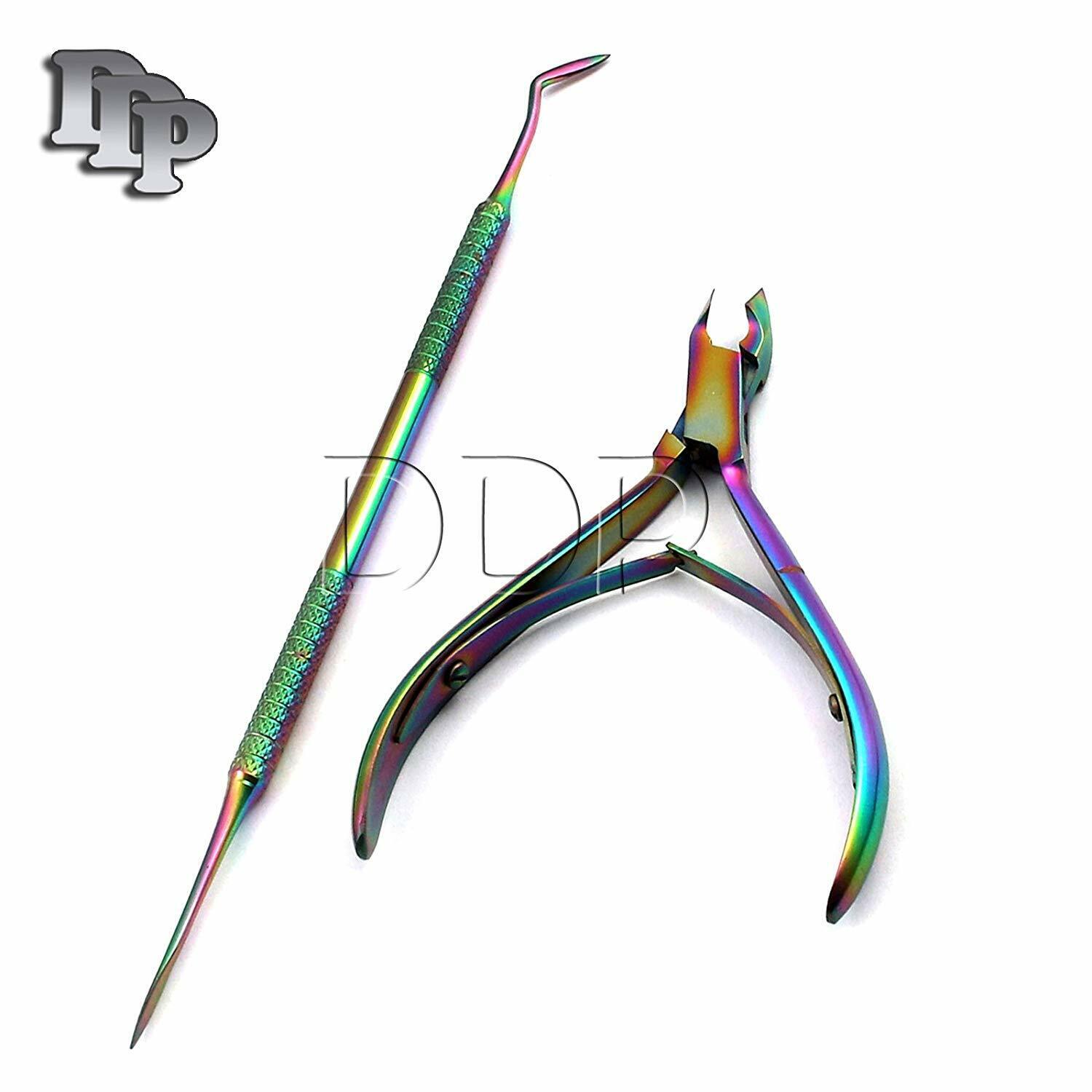 Lot Of 2 Pieces Nail Art Fingernails Toenail Cuticle Nipper Rainbow Clipper With Pedicure Pusher