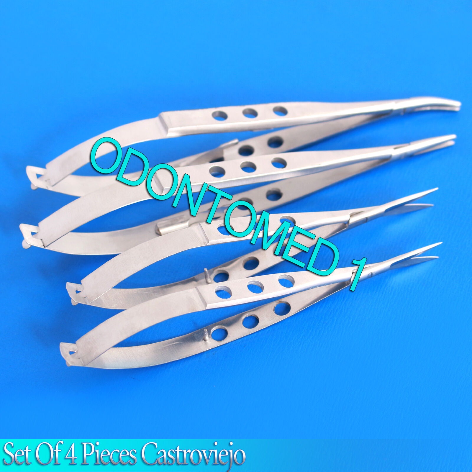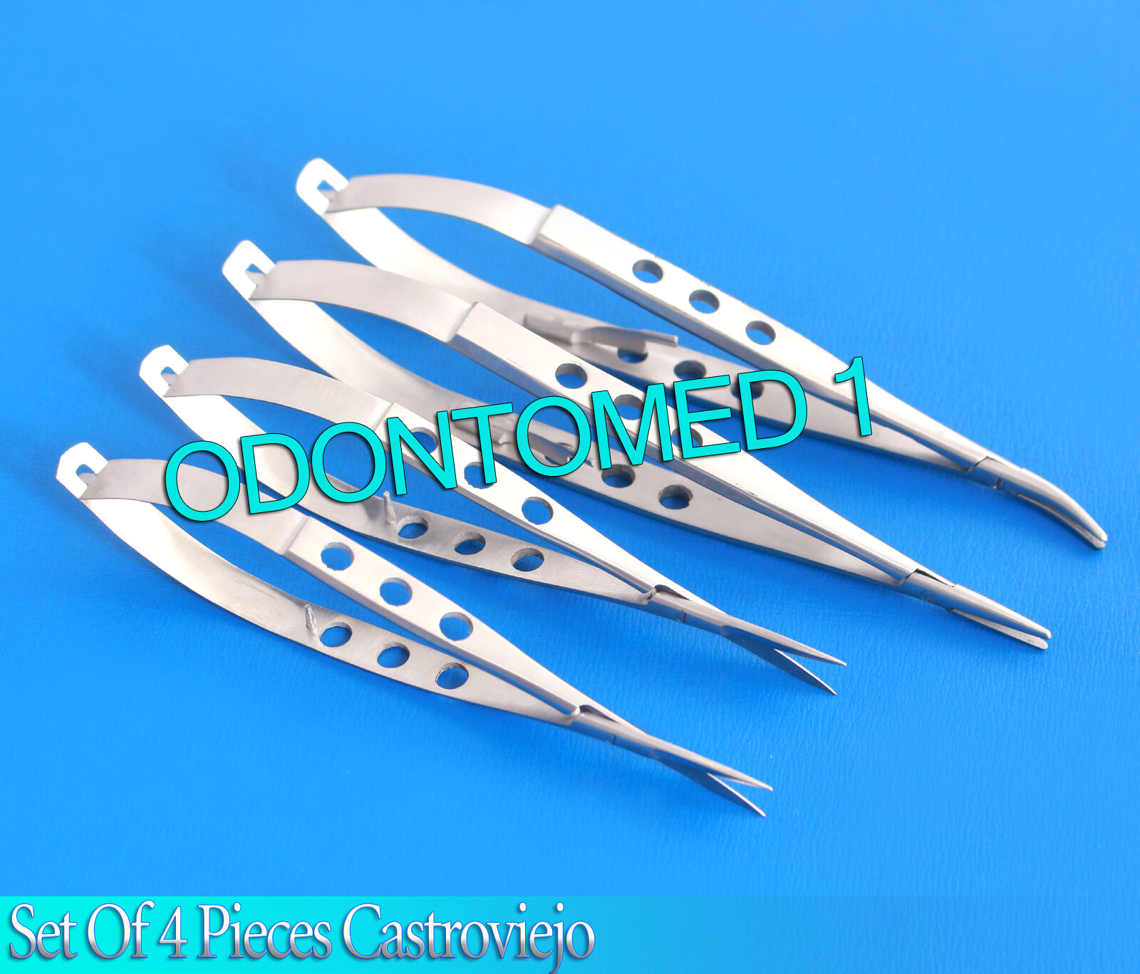 SET OF 4 EXTRA DELICATE CASTROVIEJO NEEDLE HOLDERS + SCISSORS 4″ Str+Cvd,ODM-624